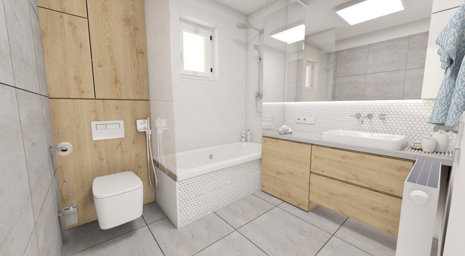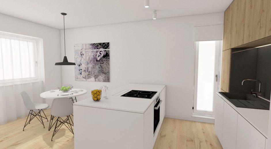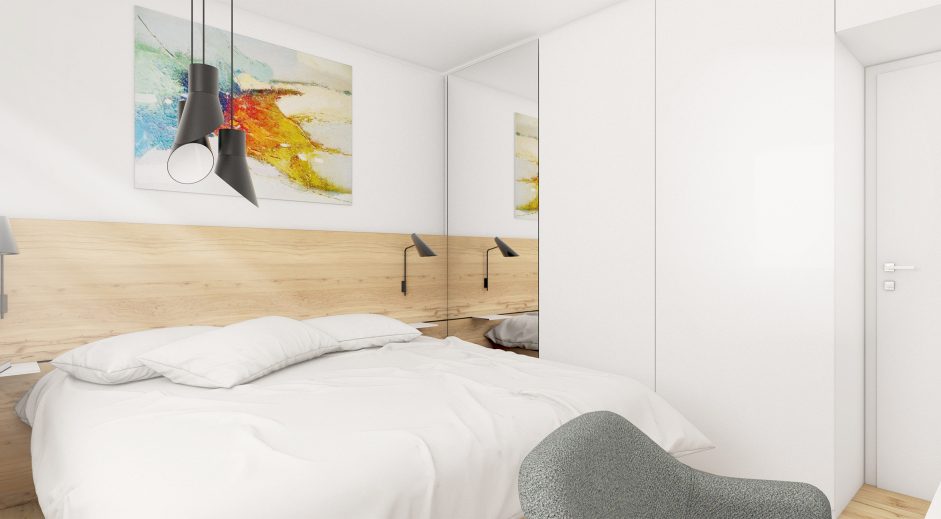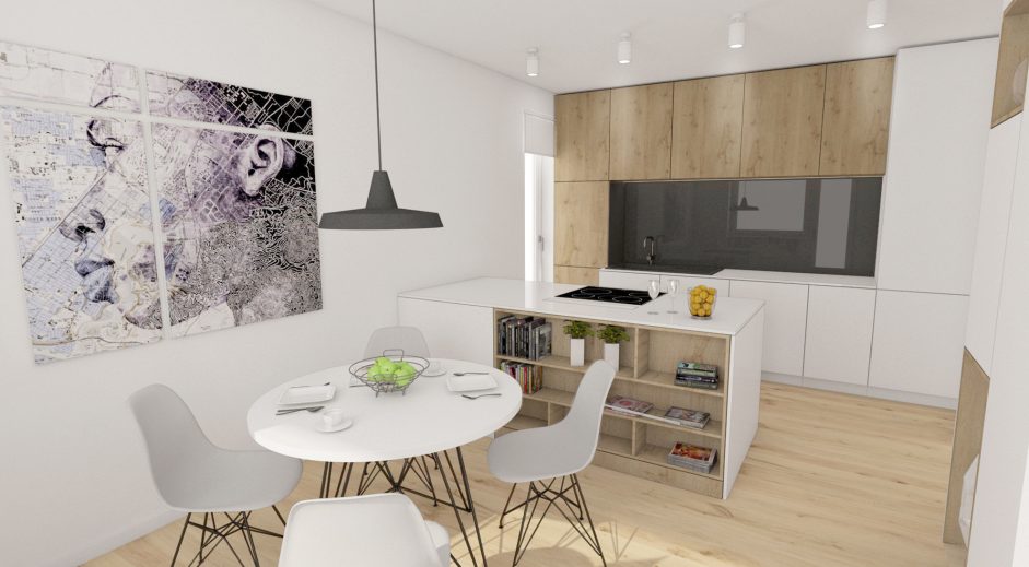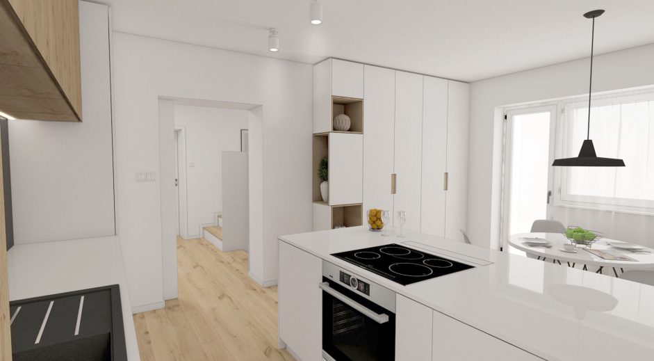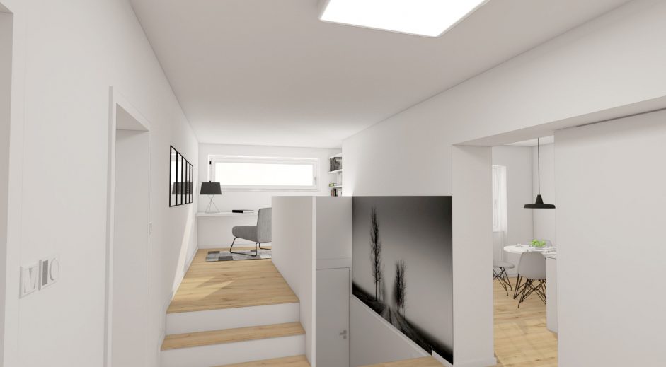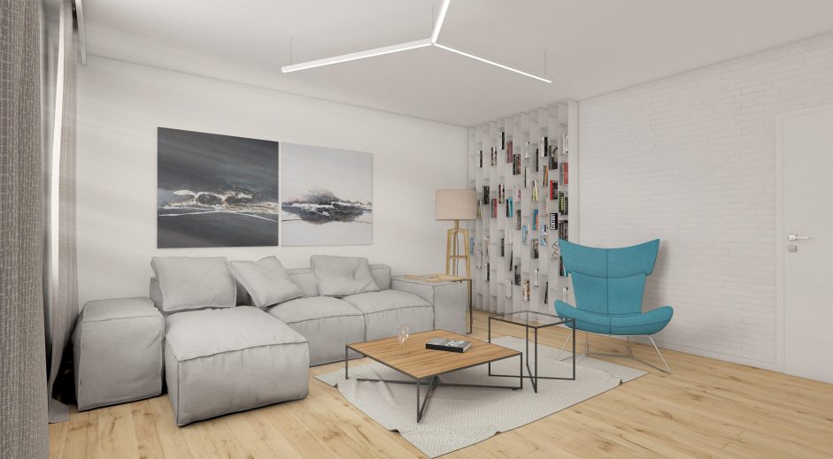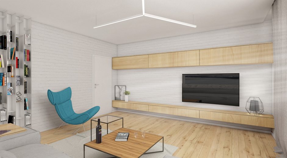 Návrh interiéru 3- izbového bytu v maloplošnom rodinnom dome v maximálnej možnej miere využíva poskytovaný priestor tak aby pôsobil priestrannejšie a pritom uspokojil požiadavky jeho obyvateľov. Materiálové stvárnenie interiéru je navrhnuté v minimalistických líniach v kombinácií s použitím prírodných masívnych drevených materiálov. Obývačke dominujú prirodzené a neutrálne materiály. Drevo na podlahe je použité v dubovom prevedení, na nábytkoch vo forme drevenej dýhy. Rovnaká drevená podlahu je použitá v celom byte, čím priestor opticky zjednocuje. Minimalistický koncept vhodne dopĺňajú prvky moderného dizajnu formou originálneho nábytku a svietidiel.