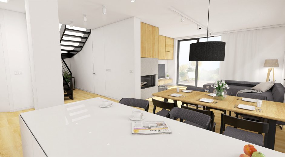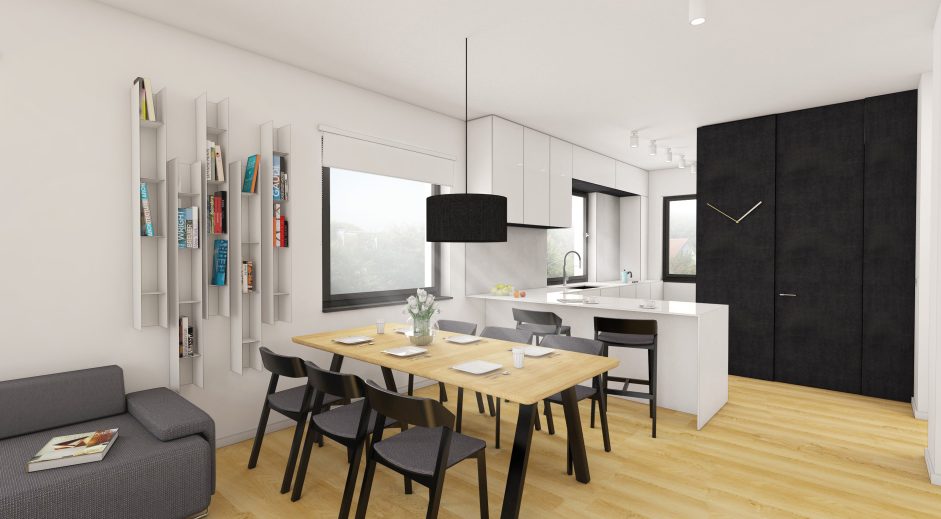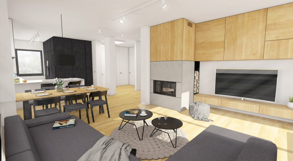 Interiér obytného priestoru nového domu definuje spojenie kuchynskej a obývacej izby. Zo vstupnej haly je priamo prístupná obývacia izba s jedálňou a kuchyňou. Hlavným prvkom obývacej izby je masívna sedacia súprava a krbová vložka s obkladom z betónu a kartáčovanej lakovanej dubovej dýhy. Celkovo interiéru dominujú prírodné materiály masívneho dubu a prírodné materiály. Rovnaké drevo s povrchovou úpravou je použité na podlahe a nábytkoch v celom byte. Nábytok na mieru z prírodných materiálov je doplnený dizajnovými kusmi typového nábytku a štýlovým osvetlením.