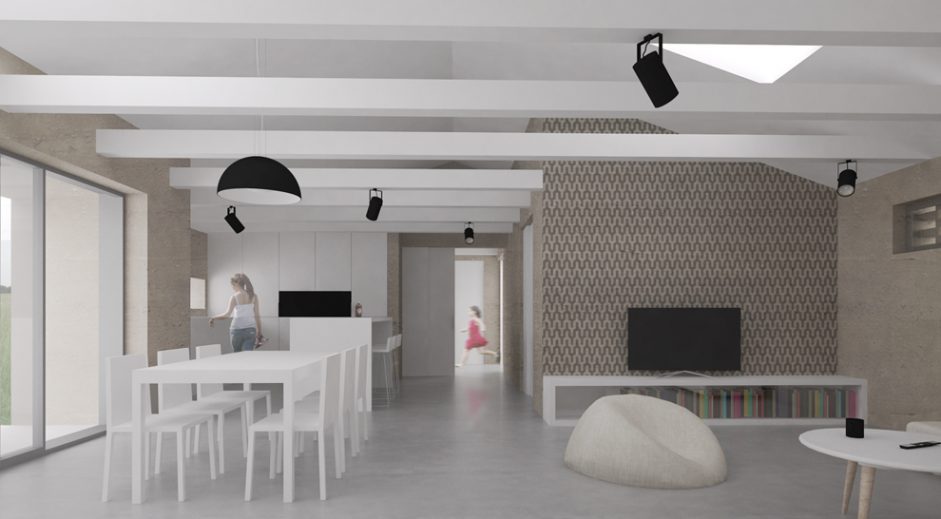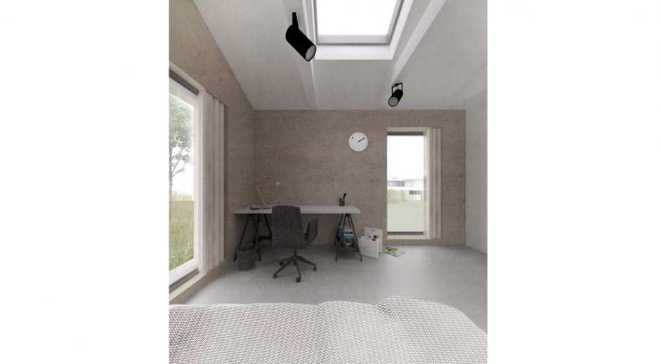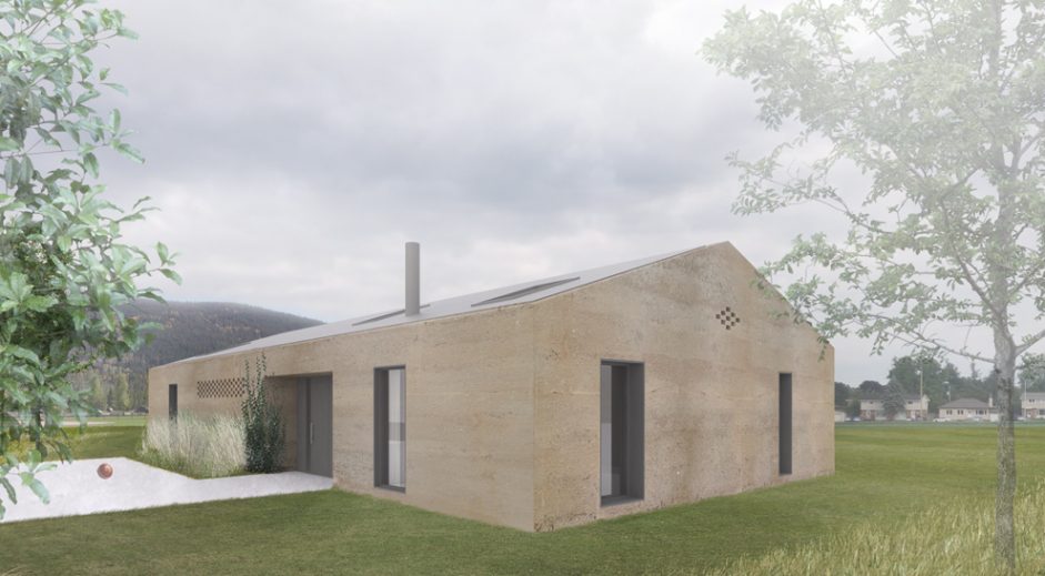 Architektonická štúdia jednopodlažného malého rodinného domu je navrhnutá pre mladú rodinu, tak aby ponúkol potrebný komfort pre bývanie v rodinnom dome a zároveň priaznivé prevádzkové náklady. Pre tento projekt sme preto uvažovali s použitím slamených prefabrikovaných panelov ako konštrukcie obvodového plášťa s aplikáciou hlinených omietok pre exteriér ako aj interiér. Kombinácia týchto materiálov ponúka ekologický stavebný systém a zdravé prostredie pre bývanie. Obytná miestnosť tvorí centrálnu časť dispozície 4 izbového domu. V obytnej časti je priznaná sedlová strecha pre zdôraznenie vzdušnosti interiéru. Zvyšné časti sú rozmiestnené v okrajových častiach dispozície.